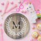 Bois de grange rustique et brun brun pâle à l'allure de planches arrière - plan avec silhouette de lauriers blancs encadrant votre choix de lettre monogramme en noir et nom de famille complet en écriture blanche. Ces assiettes sont parfaites pour les mariage ! Regardez les serviettes en papier correspondantes !