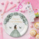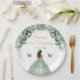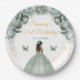 Cette assiette de fête d'anniversaire élégante et glamour présente une belle princesse à la peau foncée dans une robe de boule verte sage. Le texte combine écriture manuscrite et polices sans serif modernes pour un look élégant et sophistiqué. Les arrangements floraux, papillons et confettis d'or créent un mélange parfait de rustique et de chic. Graphiques par www.etsy.com/uk/shop/SunflowerDayLove