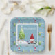A Cute Blue Square Paper Dinner Plate With Christmas Trees and Santa Gnomes