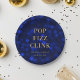 Assiettes en papier élégantes avec les mots "Pop Fizz Clink" en faux papier d'or sur un fond à motif de lumières bokeh bleu saphir. Parfait pour les fêtes de fiançailles, les mariages, les anniversaires ou divers autres événements.