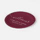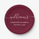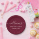 Plaques de papier mariage bordeaux personnalisées avec une police de script moderne. Personnalisez facilement en ligne avec vos détails mariages. Articles assortis disponibles pour compléter ces assiettes en papier mariage rouge bordeaux minimaliste mais élégant.