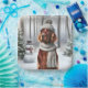 Un chien de l'Irish Setter portant un casquette tricoté gris et une écharpe se dresse dans une forêt enneigée à côté d'un bonhomme de neige pour Noël.