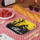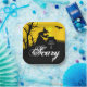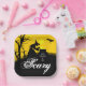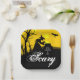 Une méchante sorcière et son chaudron, une chauve-souris noire, une clôture de piquetage et une silhouette d'arbre nu contre un ciel éffrayant, ces plaques de papier carré de la fête d'Halloween portent les mots "Mange, Bois & Soyez Effrayant". CORRESPONDRE des articles dans notre magasin.
