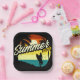 Design de style rétro avec texte "Vies d'été" avec coucher de soleil tropical et silhouette féminine surfer