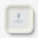 Italy inspired blue and yellow bridal shower paper plates with navy blue hand drawn doodle lemons and yellow stripes. Personalize with name and event date.