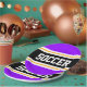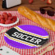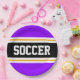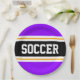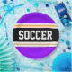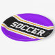 Cette conception sportive et sportive présente du texte SOCCER en gras à l'intérieur d'une large bande noire centre surlignée avec des rayures blanches et jaunes contre des rayures extérieures violettes. Le texte peut être personnalisé.