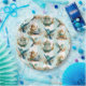 Thé d'anniversaire avec théière, tasses et colibris sur un arrière - plan rayé vert et blanc.
