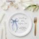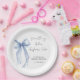 Élégantes assiettes en papier pour la douche de la mariée avec une aquarelle d'un ruban coquin bleu, "something blue before I do" dans un script calligraphique chic, et le nom de la mariée et la date de la douche dans une écriture moderne simple.