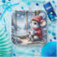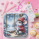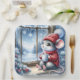 Une souris douillette en chandail rouge et un casquette assis par une fenêtre gelée tenant une tasse de cacao chaud tout en admirant un paysage enneigé avec pins et flocons de neige
