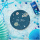 Plaques de papier d'anniversaire mignonnes avec un thème de galaxie. L'image montre quelques planètes et étoiles bleues. L'illustration semble être en trois dimensions, mais ce n'est qu'une impression. Illustré et dessiné par Patricia Alvarez.