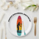 Ajoutez une touche personnalisée aux fêtes d'anniversaire et à d'autres événements spéciaux avec ces plaques de papier personnalisées. Ils présentent une illustration d'un SUP ou d'une planche à pédales debout et d'une pagaie illustrée en couleurs vibrantes du coucher de soleil avec une illustration en silhouette en noir de quelqu'un qui pagaie. Votre propre message est au-dessus du graphique en lettres noires en gras.