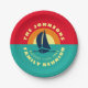 Summer family réunion lac fête nom personnalisé Plaque de papier. Ajoutez votre nom de famille et votre date. Coucher de soleil rouge avec eau bleue et silhouette de voilier. Fournitures jetables pour la fête de jardin, barbecue, réunion de famille, réunion, dîner, voyage, jour de plage, etc.