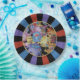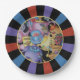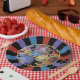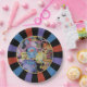Ensemble de huit plaques en papier de 9 pouces avec une image de teacups et théières colorées encadrées d'un sunburst noir, violet, bleu et orange. Voir les dessous de verre en plastique et en papier correspondants. Voir l'ensemble de la collection Wonderland Plate dans FOOD/BEV | Section Plats.