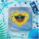 Tournesol jaune avec lunettes de soleil coeur dans un cadre abstrait en forme de coeur sur un arrière - plan du ciel d'été.
