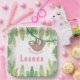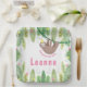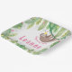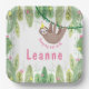 Des feuilles de jungle ludique et vert foncé décorent ce thème de jungle | plaques de papier d'anniversaire paresseux. Super mignon paresseux accroché à une vigne verte dans la jungle. Amusant paresseux, le paresseux est accompagné d'un casquette à pois jaune et blanc ! Des fleurs bleues, jaunes et roses ornent les feuilles de la jungle. Plaques de papier parfaites pour l'anniversaire animal, zoo, paresseux, ou autre safari / jungle thème.