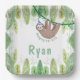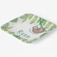 Des feuilles de jungle ludique et vert foncé décorent ce thème de jungle | plaques de papier d'anniversaire paresseux. Super mignon paresseux accroché à une vigne verte dans la jungle. Amusant paresseux, le paresseux est accompagné d'un casquette de soirée à pois bleu et blanc ! Plaques de papier parfaites pour l'anniversaire animal, zoo, paresseux, ou autre safari / jungle thème.