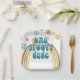 Super One Retro a inspiré des plaques de premier anniversaire avec des polices de style années 70 et des couleurs arc-en-ciel et des signes de paix.