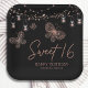 Sweet 16 Rose Gold Butterfly Chic Modern Birthday Paper Party Plates dispose d'élégants papillons rose en or avec des lampes à cordes sur un arrière - plan noir avec Sweet 16 en élégant script de calligraphie avec "Happy Birthday" et personnalisée avec votre nom personnalisé ci-dessous. Personnalisez en modifiant le texte dans les zones de texte. Conçu pour vous par ©Evco Studio www.zazzle.com/store/evcostudio