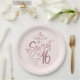 Personalized Sweet 16 Sixteen rose gold paper plates with modern calligraphy sign. Add your own text with easy to use Zazzle tools!