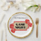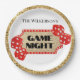 Ces assiettes de fête personnalisées sont décorées d'un thème de nuit de jeu glamour sur un arrière - plan blanc. Un panneau de parties scintillant est placé au centre, avec un arrière - plan de parties scintillant dorée et une bordure rouge avec des lumières. Parties scintillant rouge jouant des dés sont placés de chaque côté du panneau Un cadre de bordure de paillettes d'or encadre la plaque.