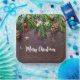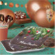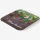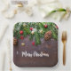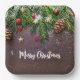 Plaques en papier avec une photo rustique d'une table en bois marron avec pinecones, aiguilles de pin, neige et ornements de Noël. Festif et adorable.