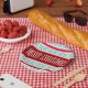 Belles plaques de papier avec motif rouge/aqua et texte personnalisable.