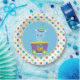 Ce plat de partie comporte un arrière - plan bleu entouré par un bagout de répétition des étoiles rouges, bleues, jaunes et vertes. Un hippopotame mignon de bébé (hippopotame) utilisant un casquette de partie dans une voiture de train pourpre se repose au milieu du plat.