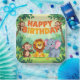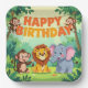 Thème de safari joyeux anniversaire avec singes, lion et éléphant dans la jungle.