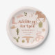 Assiette en papier thème mariage occidental rustique avec illustration de motifs de cowgirl. Le texte dit "se mettre en selle pour l'amour."