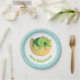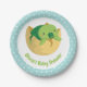 Le Baby shower fournit des assiettes en papier avec une nouvelle tortue verte éclos! Le petit a une petite tétine verte. Cercle blanc et arrière - plan bleu avec motif pois. Ajoutez votre message dans l'espace prévu à cet effet.