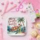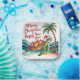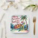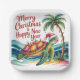 Une carte de voeux de Noël fantaisiste avec une aquarelle joyeuse illustrant une tortue de mer portant un chapeau de Père Noël festif et ornée de lumières scintillantes de Noël enfilées autour de sa coquille, posée sur fond de palmier balançant également éclairé par des lumières chaudes et un océan turquoise serein. La coquille de la tortue est peinte de motifs complexes de fleurs tropicales dans les tons pastel doux de corail, lavande et vert d'eau de mer, tandis que l'océan brille avec de subtils gradients de bleu et d'argent, créant une atmosphère paisible mais festive. "MERRY CHRISTMAS & HAPPY NEW YEAR" apparaît dans une police ludique et lettrée sur le dessus de la carte, avec l'intérieur offrant un espace blanc propre pour un message personnalisé et un motif subtil et répétitif de petits coquillages le long du bord inférieur pour renforcer le thème tropical. Le ton général est léger et joyeux, parfait pour envoyer des voeux chaleureux à des amis et à la famille pendant la période des fêtes.