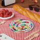 Un design amusant qui présente des pois et un grand tourbillon dans un éventail de couleurs.