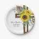 De beaux tournesols gais, des eucalyptus et de l'herbe à la pampa exposés sur une croix en bois foncé créent ce design floral pour vos assiettes de baptême. La grande taille de la croix crée un look mis à jour. Le nom et la date de baptême sont également affichés sur l'assiette. Cette plaque en papier est parfaite pour tout baptême de fin d'été ou d'automne.