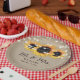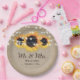 Plaques de papier mariage de burlap et de tournesol personnalisées avec des tournesols et des lampes à cordes sur un arrière - plan de burlap. Objets correspondants disponibles pour compléter ces plaques de papier mariage à fleurs rustiques. Personnalisez facilement à toute occasion.