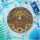 Bel design rustique avec des tournesols peints à la main dans un bocal de mason avec initiales de couple. Lumières à cordes en arrière - plan sur bois foncé vintage. Le souffle du tournesol et du bébé au fond. Nom du couple et date du mariage au milieu de l'assiette.