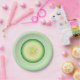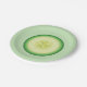 Cette plaque en papier présente une illustration en caricature verte d'une tranche de concombre.