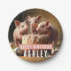 Plaques en papier d'anniversaire avec un gâteau d'anniversaire de trois petits cochons avec "Joyeux anniversaire", police audacieuse casquette. Personnalisez-le en ajoutant votre ou vos nom(s).