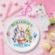 Trois rex dinosaures mignonette de fête d'anniversaire vaisselle personnalisée, trois dinosaures mignons en casquettes de fête avec un confetti de gâteau d'anniversaire et ballons tomber autour pour les petits enfants plus petits dinosaures fête d'anniversaire thème dinosaure.