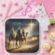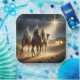 Trois voyageurs à dos de chameaux se rendent dans le ciel nocturne pour voir une étoile brillante qui éclaire doucement le paysage