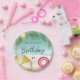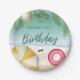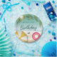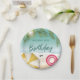 Bring summer fun to the party with these beach-themed paper plates designed by Destei. Light teal waves touch the sandy shore, framed by tropical palm leaves and a peek of sun on the top. On the sand, a yellow striped beach umbrella, pink swim ring and black sunglasses add playful summer touch. The center has space to write custom text, making every plate feel personal and festive for your celebration.