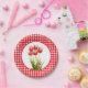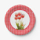 Créez un paysage de table confortable avec cette plaque de papier tulipe rouge. Cette plaque en papier floral de style printanier est ornée d'une bordure en plaid en vichy rouge et blanc. Votre table d'occasion printanière sera belle avec un vase de tulipes rouges. Utilisez cette assiette pour une variété de vacances de printemps et d'occasions.