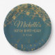 Plaques de papier personnalisées de fête d'anniversaire customisées pour le 50e anniversaire d'une femme avec des lampes à cordes dorées scintillantes et un bokeh pétillant sur un arrière - plan turquoise audacieux. Ce modèle est conçu pour que vous puissiez modifier n'importe quel texte, ce qui le rend parfait pour une fête célébrant n'importe quel âge.