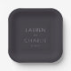Cette élégante assiette de mariage présente un design minimaliste avec un fond charbon de bois profond et un texte blanc épuré, créant un contraste sophistiqué. La mise en page est centrée, mettant en valeur deux noms personnalisables dans une police sans-serif simple, suivis d'une date, le tout disposé verticalement pour un aspect équilibré. Son esthétique moderne met l'accent sur la clarté et la formalité, ce qui la rend parfaite pour les mariages ou les événements formels. L'absence de motifs supplémentaires maintient l'attention sur le texte personnalisé, transmettant une élégance discrète idéale pour célébrer des occasions importantes.