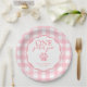 Célébrez-la une année d'or dans le style chiot sucré avec cette plaque de papier rond. Une bordure rose en vichy entoure un centre à pétoncles qui comporte un empreinte de patte en vichy et un texte modifiable pour le nom de votre fille et la date de son premier anniversaire. Idéal pour les tranches de gâteau, les collations et les réglages de table prêt à la photo à n'importe quelle soirée à thème golden retriever.