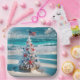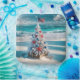Un sapin blanc de Noël orné de décorations bleues et rouges se dresse sur une plage de sable, surmontée d'un drapeau américain