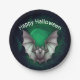 Cette plaque de papier a un gris volant déplaisant avec des chauves-souris teintées vertes avec des ailes écartées d'une grotte verte brumeuse. Customisez le texte Happy Halloween avec le modèle.