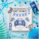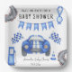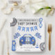 Carte d'invitation baby shower à thème de voiture de course avec des illustrations aquarelle d'une voiture de course bleue.