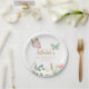 Plaque de papier de fête d'anniversaire mignonne avec papillon rose et menthe avec des embellissements en faux or. Il y a un jardin fleuri au fond. Customisez ce produit en ajoutant les informations de votre partie.
