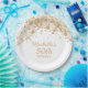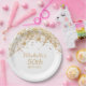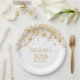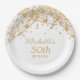 Plaques de papier de fête d'anniversaire blanc avec parties scintillant or et lampes à cordes customisées avec le nom et l'âge de l'invité d'honneur.