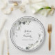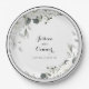 Une subtile assiette de mariage blanc avec une aquarelle délicatement peinte de fleurs de pivoines blanches et de verdure d'eucalyptus avec un script traditionnel écrit à la main dans une calligraphie à pointes noires annonce vos noms et date mariage.